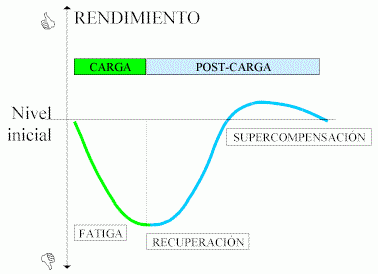 El rendimiento está estrechamente relacionado con la fatiga. Como se puede observar en la imagen, el nivel inicial de rendimiento se representa en la línea base. Tras la realización de un entrenamiento, se genera fatiga, lo que provoca una disminución temporal en el rendimiento. Posteriormente, durante la etapa de recuperación, el cuerpo se adapta y el rendimiento experimenta un incremento, conocido como supercompensación. Sin embargo, si no se realiza un nuevo estímulo de entrenamiento en esta fase, el rendimiento regresa progresivamente a su estado inicial.